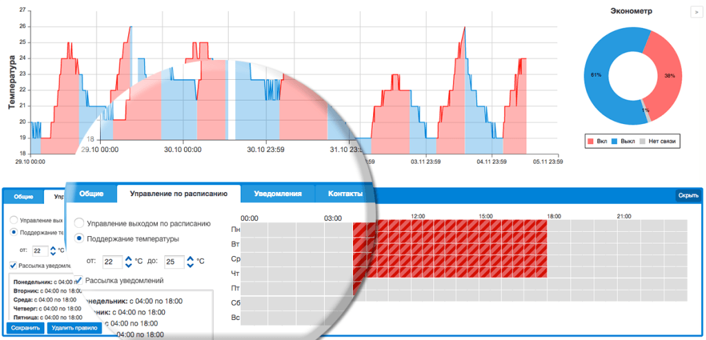 За температурой можно следить в онлайн-режиме с мобильного или компьютера. Настроить оповещения и команды можно также через sms-сервис. Подключить можно любое количество розеток: для каждого этажа, прибора или помещения.