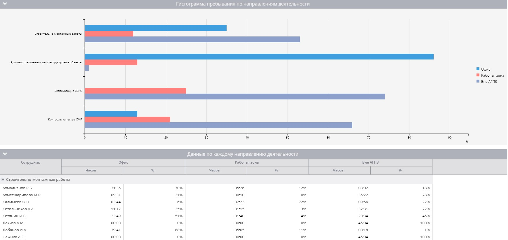 Основные категории геозон на заводе: рабочая зона, офис и вне территории АГПЗ. В системе мониторинга можно смотреть, на какой из территорий находятся сотрудники — чем именно они сейчас заняты. Этот параметр необходим для отчетности, о которой мы расскажем далее.